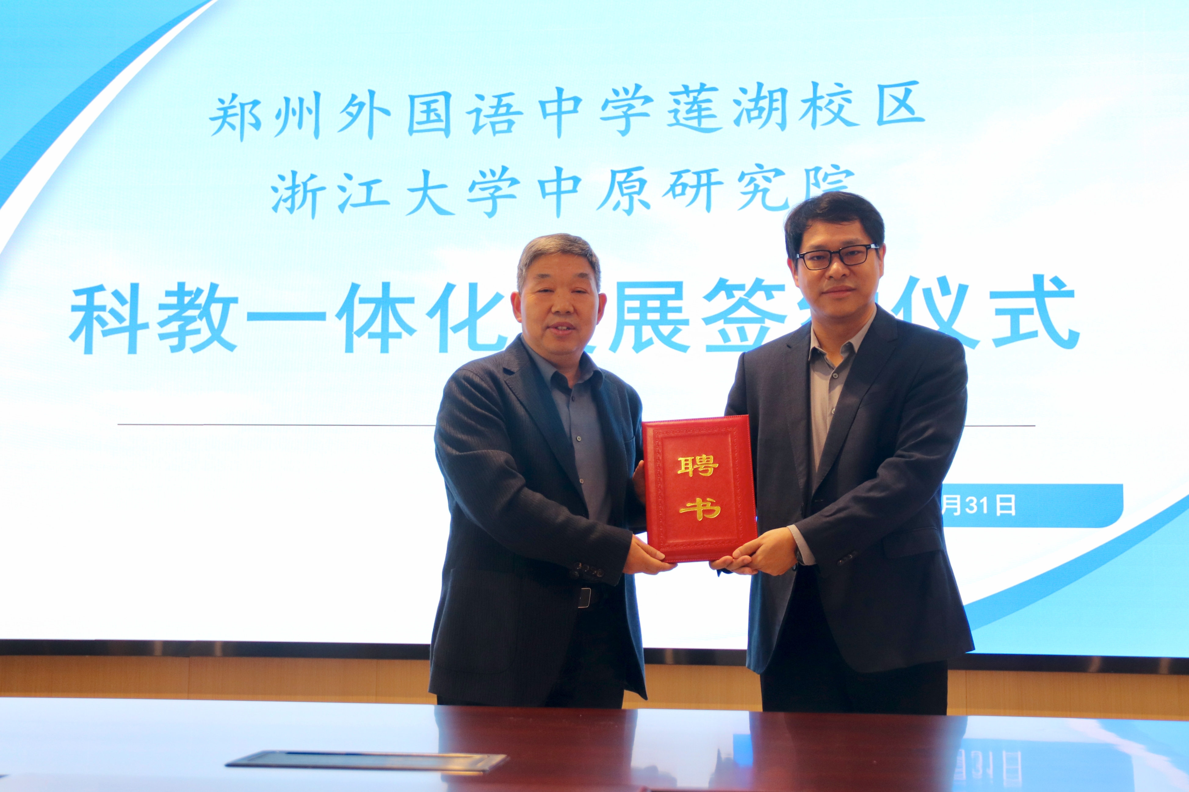 活动现场,郑州外国语中学莲湖校区党委副书记胡应彬为金盛教授颁发了科学副校长聘书,标志着院校双方科普交流合作的进一步深化。