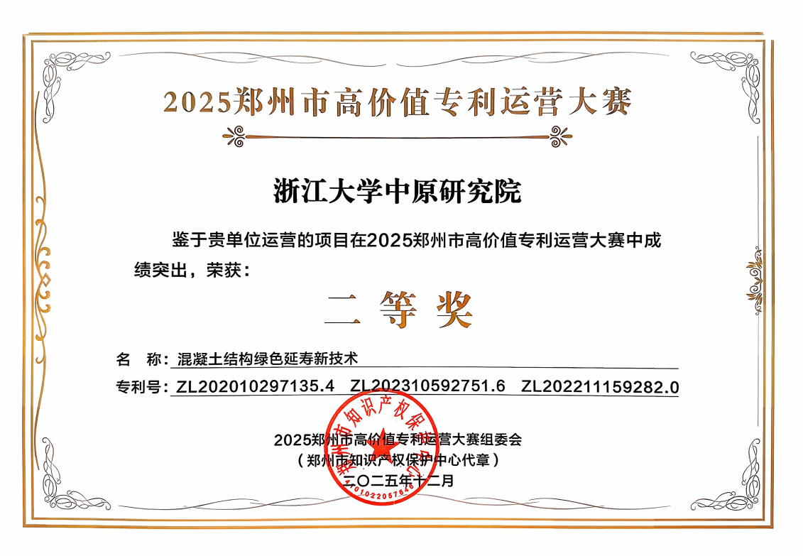 近日,郑州市高价值专利运营大赛落下帷幕,我院新材料研究中心黄正强博士团队的“混凝土基础设施绿色延寿技术”专利项目凭借突出的创新价值与产业化实力,荣获大赛二等奖。
