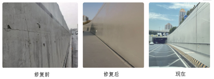 这项技术也在郑州京广路隧道的修复中得到了应用。2020 年,研究院团队承接京广路隧道修复工程,针对隧道内壁潮湿、渗漏、积污等痛点,团队通过精细化修补与硅烷底漆涂刷,赋予内壁防水、抗污、耐磨三重性能。历经多次强降雨考验,防护区域仍完好如初,无渗水、剥落痕迹,与未采用长效防护的区域形成鲜明对比,筑牢了城市交通安全防线。