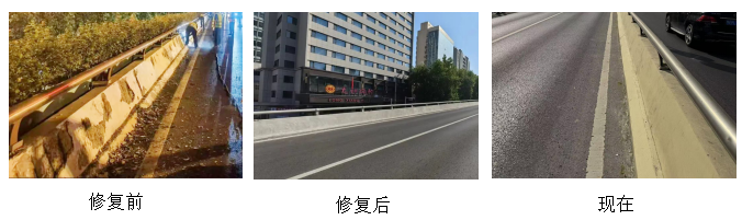 在郑州紫荆山立交修复工程中,该技术交出亮眼答卷。这座承载郑州30年交通记忆的枢纽桥梁,防撞墙曾因常年车辆刮擦、四季冻融循环,出现混凝土裸露、钢筋锈蚀等“老年病”,此前多次用普通涂料修复,难逃一年内外层剥落的命运。2024年9月,研究院与郑州市政设施事务中心联合定制施工方案,采用“有色硅烷底漆 + 超疏水自清洁涂层”复合工艺——灰色底漆筑牢防护根基,自清洁涂层让灰尘“不沾身”、雨水一冲即净,再搭配新型弹性伸缩缝胶状剂,完美适配桥梁变形需求。如今近2年过去,修复后的防撞墙依旧平整光滑,成为老桥“逆龄”的直观见证。