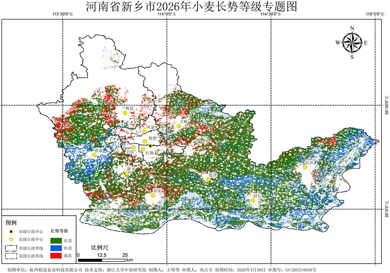 依托中高分卫星遥感技术与农业相关算法模型,我院农业遥感与信息技术研究中心团队精准捕捉全省冬小麦苗情动态,快速提取麦田长势等级、区域分布等核心信息,为各级农业部门开展精准田间管理、推动晚播小麦促弱转壮提供科学支撑,也为全省小麦苗情监测、长势研判及夏粮丰产保障奠定坚实技术基础。